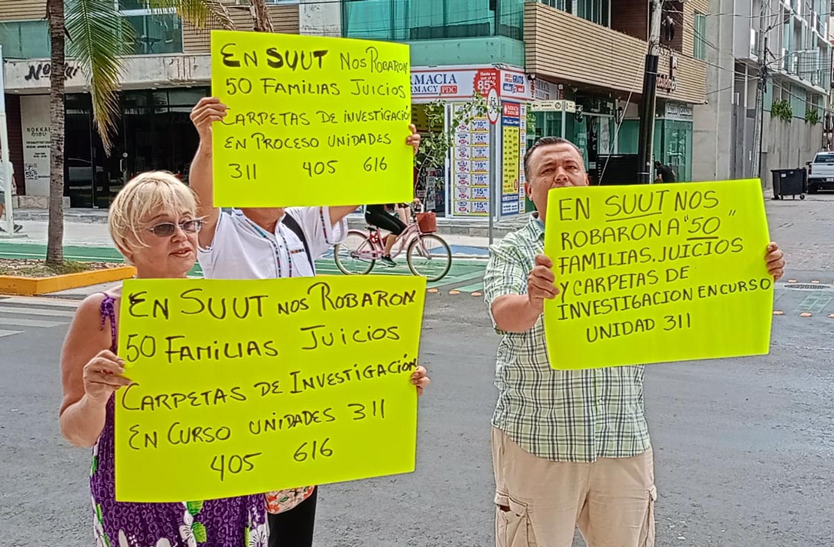 Playa del Carmen.- Un grupo de compradores de departamentos se manifestó este jueves a las afueras del hotel donde se llevaría a cabo la reunión mensual de la Asociación Mexicana de Profesionales Inmobiliarios (AMPI), para denunciar un presunto fraude inmobiliario relacionado con el proyecto SUUT, cuya reactivación sería presentada públicamente.