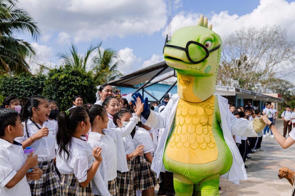 En Tixcancal también estudia la alumna Ana Beatriz May May, quien, por su talento, ganó el concurso para diseñar la botarga de la Secihti, llamada “K’awiil k’in”, un tolok científico que acompañó a la escuela durante esta jornada de aprendizaje y diversión.