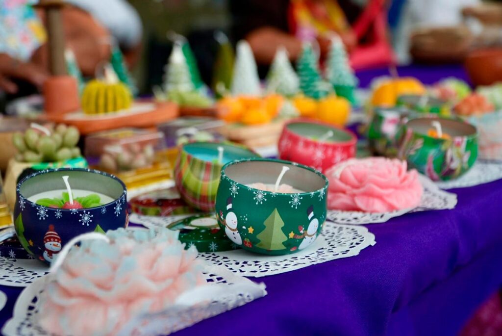Los artículos ofrecidos en las ferias incluyen piezas elaboradas con jícaras, textiles, productos de piel, calzado, bisutería, amuletos, ornamentos, así como platillos y postres regionales, reflejando la diversidad del trabajo artesanal y gastronómico de las mujeres yucatecas.