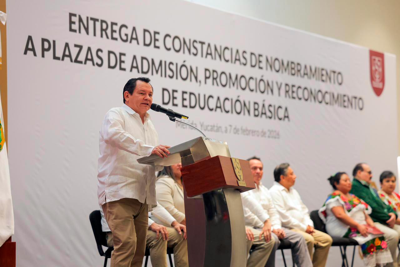 En cumplimiento de su compromiso con la justicia laboral y la transparencia, el Gobernador Joaquín Díaz Mena encabezó la entrega de 582 plazas a maestras y maestros de educación básica, en reconocimiento a sus años de estudio, trabajo constante y vocación de servicio, mediante un proceso claro, objetivo y justo que brinda certeza laboral al personal de la Secretaría de Educación del Estado de Yucatán (Segey).