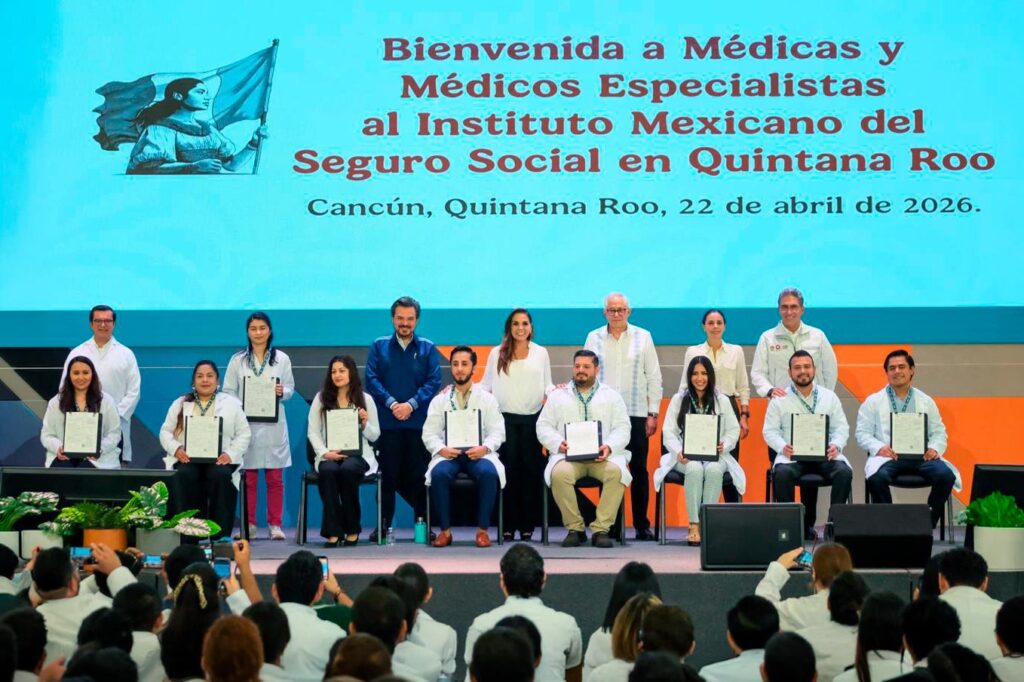 Cancún.- Con la presencia del director general del Instituto Mexicano del Seguro Social (IMSS), Zoé Robledo Aburto, la gobernadora Mara Lezama Espinosa encabezó la ceremonia de bienvenida de 123 médicas y médicos especialistas que se integran al Instituto en Quintana Roo, como parte del histórico fortalecimiento del sistema de salud en la entidad.