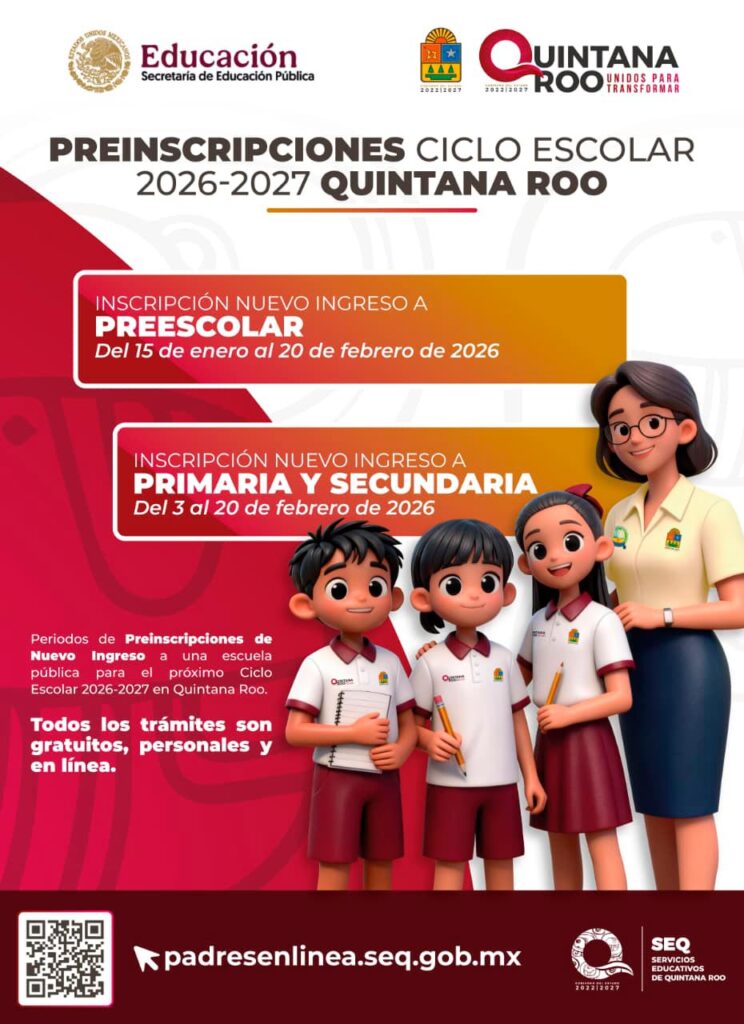 Chetumal.- Del 15 de enero al 20 de febrero, las madres, padres de familia y tutores podrán registrar a sus hijos en el proceso de inscripciones para educación preescolar, correspondiente al ciclo escolar 2026-2027, en la página: https://padresenlinea.seq.gob.mx
