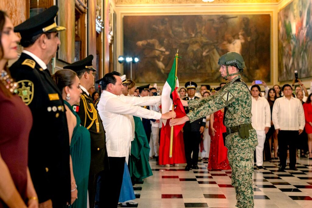 Acompañado de su esposa, la presidenta honoraria del DIF Yucatán, Mtra. Wendy Méndez Naal, de sus hijos Joaquín y Julián Díaz Méndez, así como de autoridades civiles y militares, el mandatario estatal salió al balcón central del Palacio de Gobierno para recordar a los héroes que dieron libertad a la nación y ondear la Bandera Nacional ante la multitud.