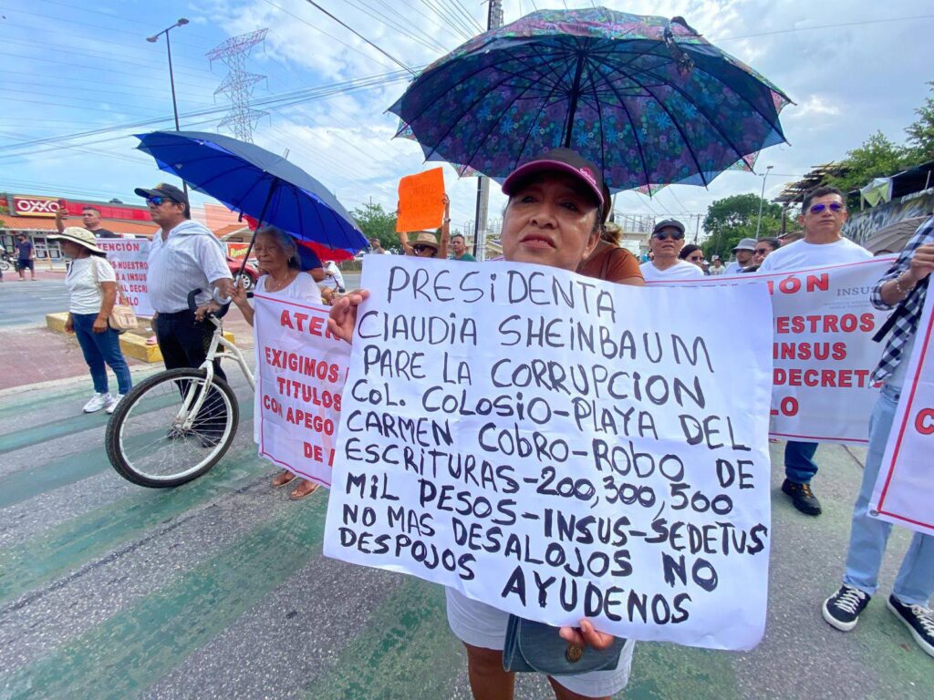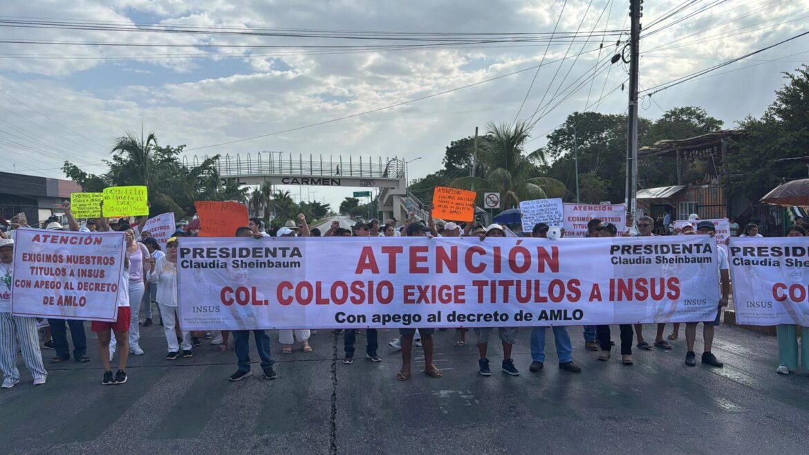 Entre los mensajes exhibidos durante la manifestación destacaron consignas como “Atención, Col. Colosio, exige títulos a INSUS con apego al decreto de AMLO”, “Presidenta Claudia Sheinbaum: exigimos nuestros títulos”, “No más promesas, queremos resultados”, entre otros.